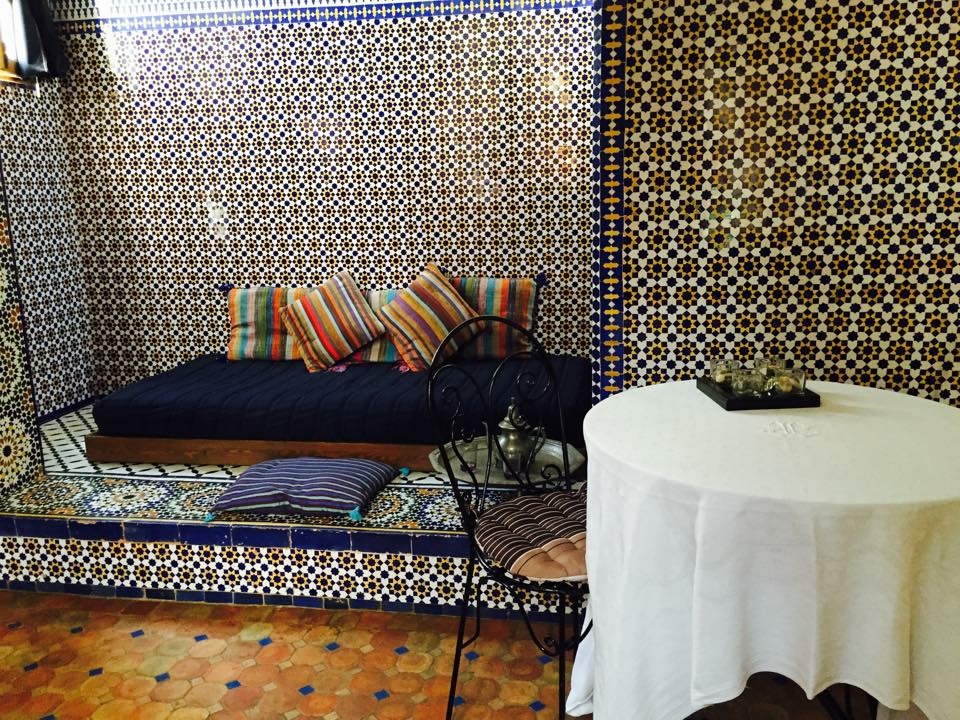 Petit salon dans alcôve avec mosaïques de zelliges à motif de zig zag triangle carré - attributs décoratifs omniprésents