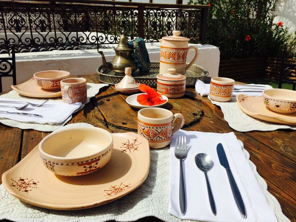 Vaisselle de Salé ( potier local ), linge brodé, théière traditionnelle et fleurs fraîches pour bien démarrer la journée