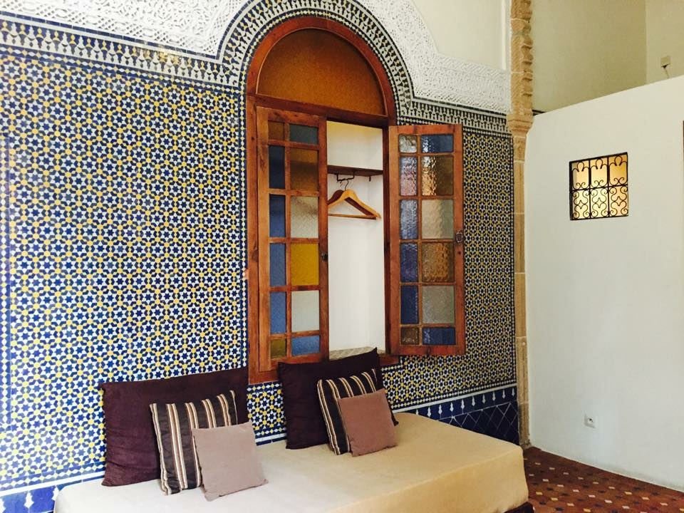 Espace de rangement dans une fausse fenêtre contigu à un salon confortable pouvant servir de lit d'appoint
